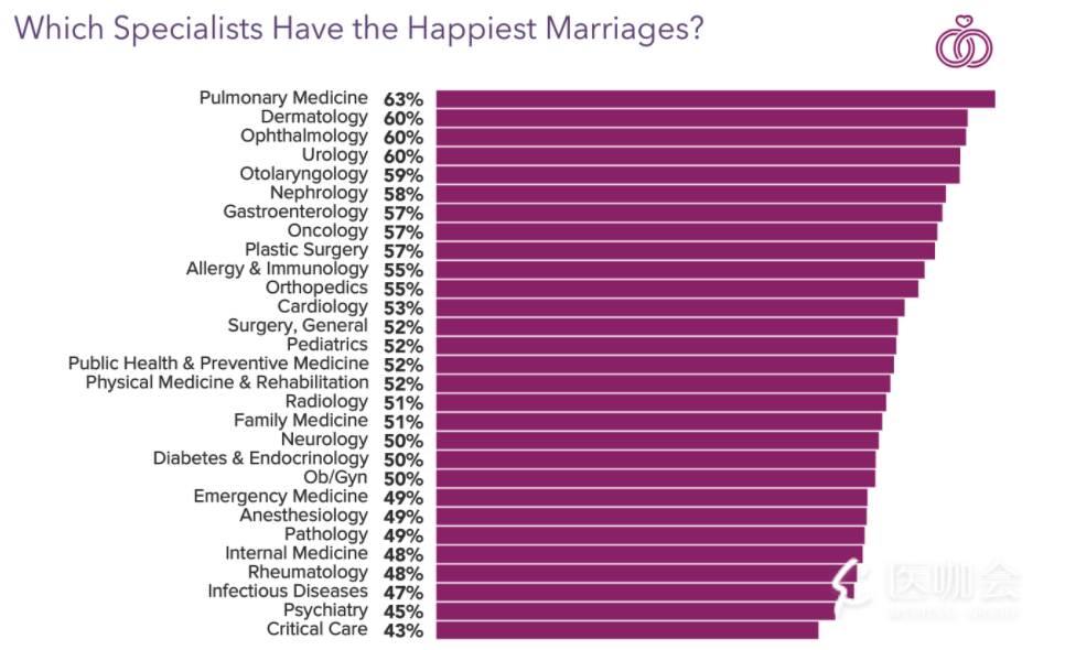 呼吸科、皮肤科、眼科和泌尿科医生的婚姻幸福度最高;重症医学科和精神科垫底。
