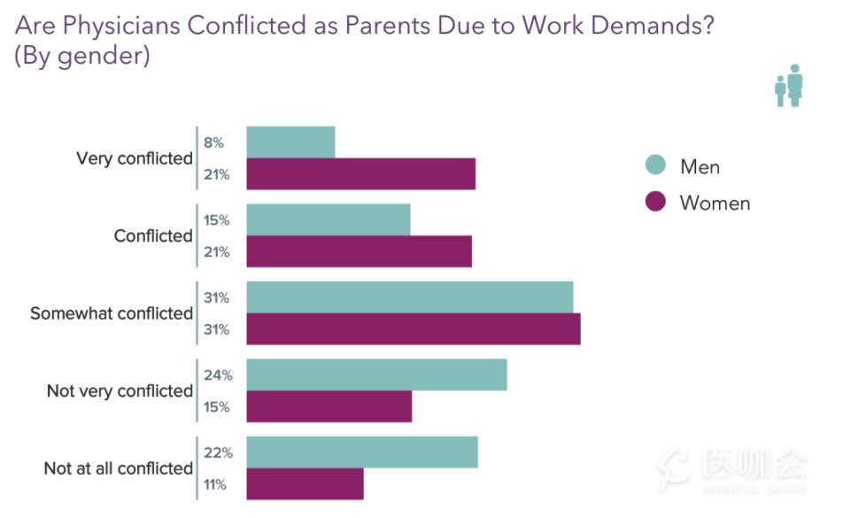 整体来讲,30%的医生表示在平衡工作和照顾孩子上存在冲突或者很大冲突。男医生和女医生的差别较大,男医生中选择这两项的占比为23%,女医生达到了42%。疫情之下,女医生的压力感比以前更大。