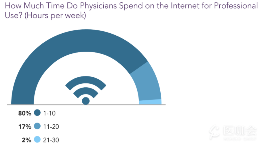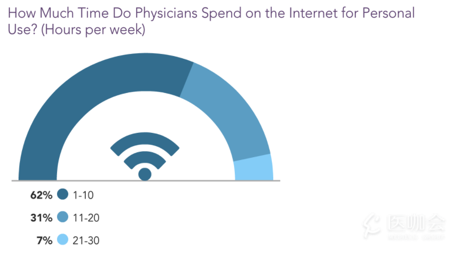 62%的医生每周因个人目的上网的时间不超过10个小时。即使将医生个人目的和工作需要上网的时间加起来,也比平均互联网用户使用时长要短很多。
