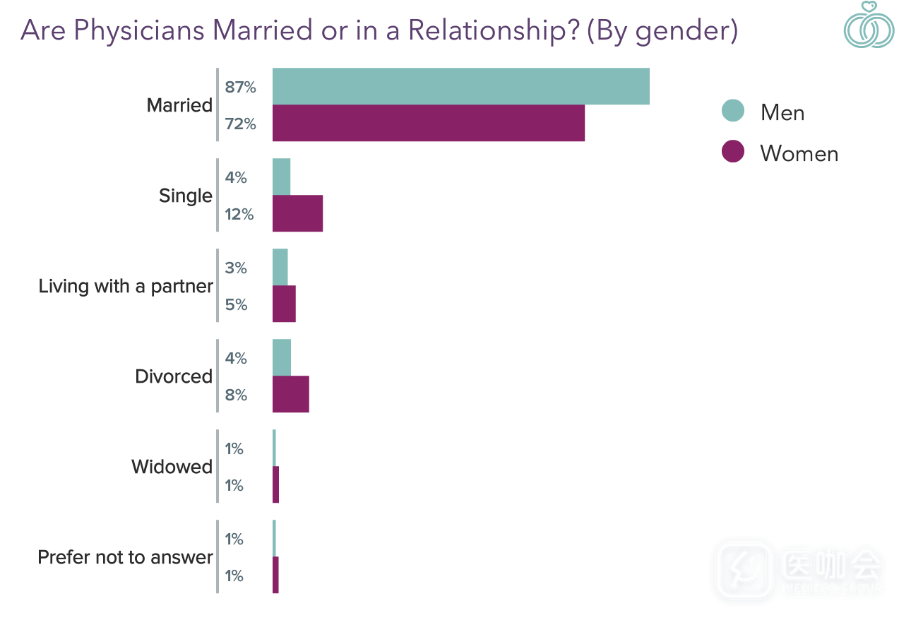 大多数医生都有另一半,85%的医生已结婚或与伴侣同居:其中男医生中和女医生中的这一占比分别为90%和77%。