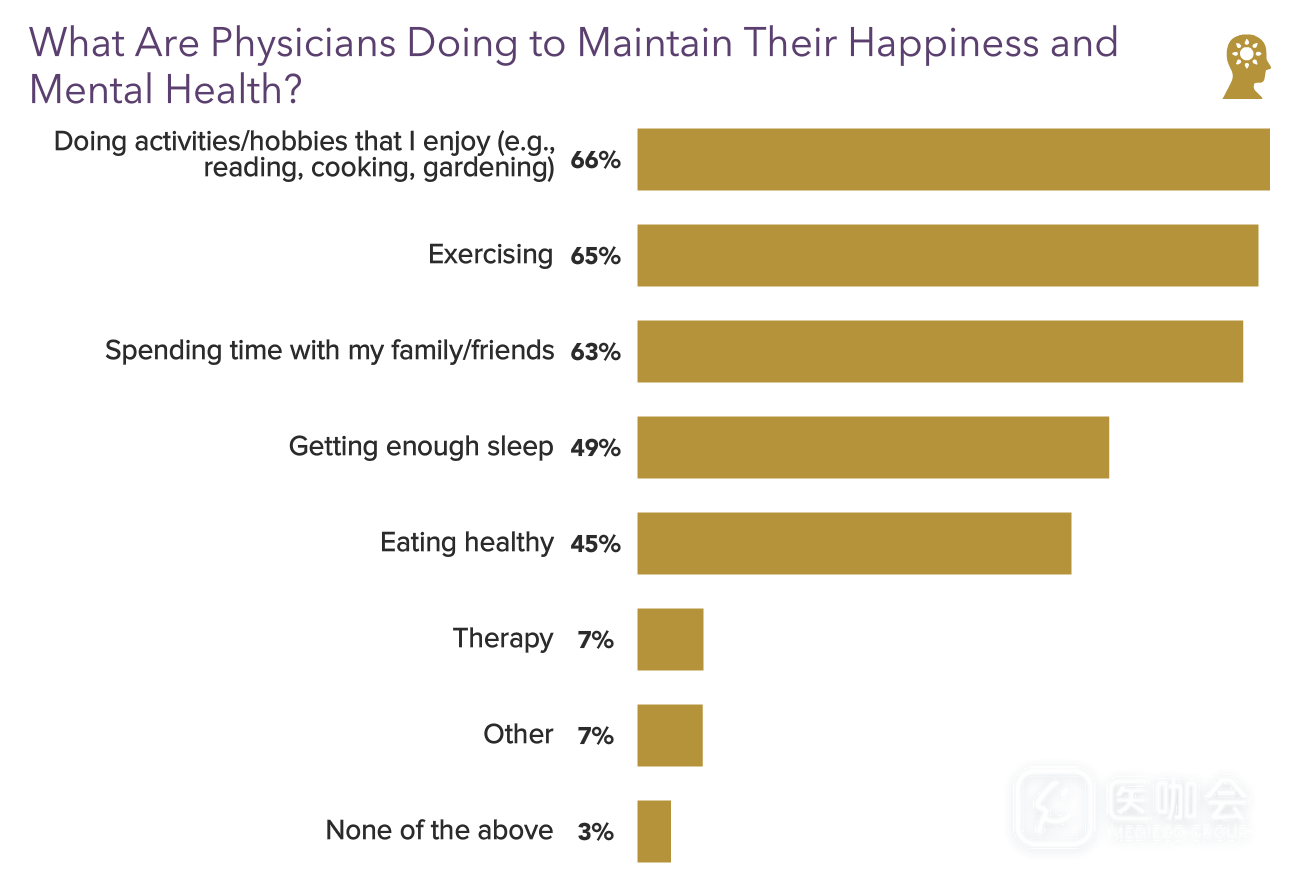 疫情期间,通过个人爱好(如读书、烹饪)或者运动来维持幸福感的医生,均占到了三分之二左右;依赖家人和朋友占比达到了63%。其他常见方式还包括睡得好(49%)和吃得好(45%)。