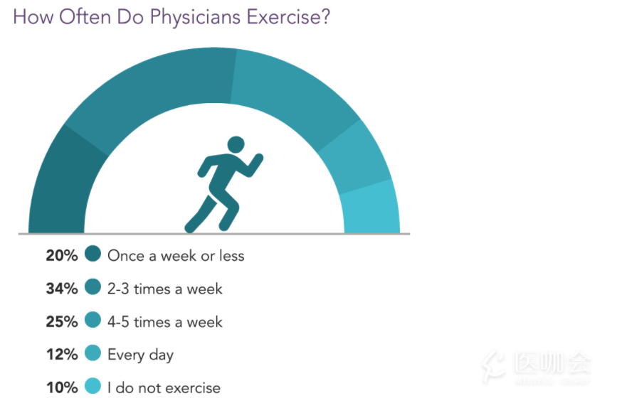 70%的医生表示一周锻炼≥2次。2020年3月,WHO发布的运动和久坐行为指南中指出,成年人每周应至少进行150-300分钟的中等强度有氧运动;或至少75-150分钟的高强度有氧活动。