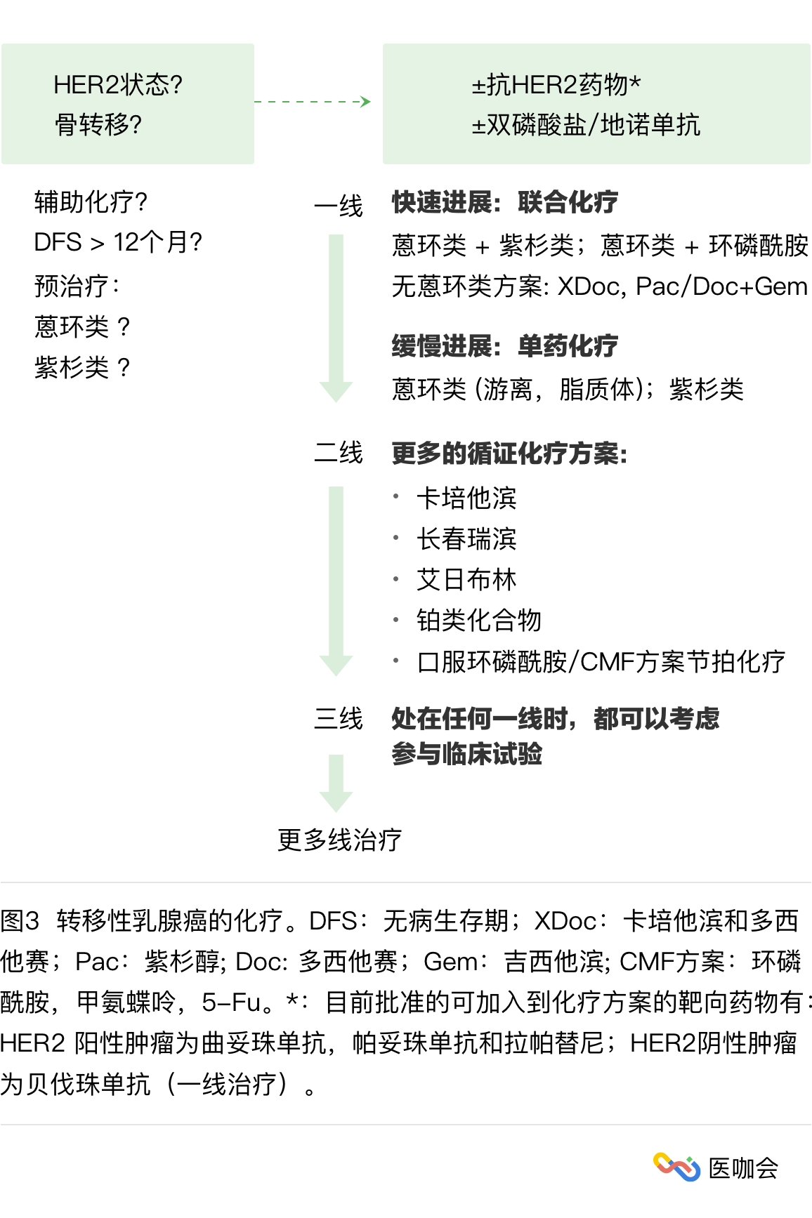 除非患者的症状要求联合化疗,否则通常推荐序贯的单药化疗。可以给予患者单药化疗直到疾病进展或不可耐受的毒性。转移性乳腺癌的化疗详见图3。