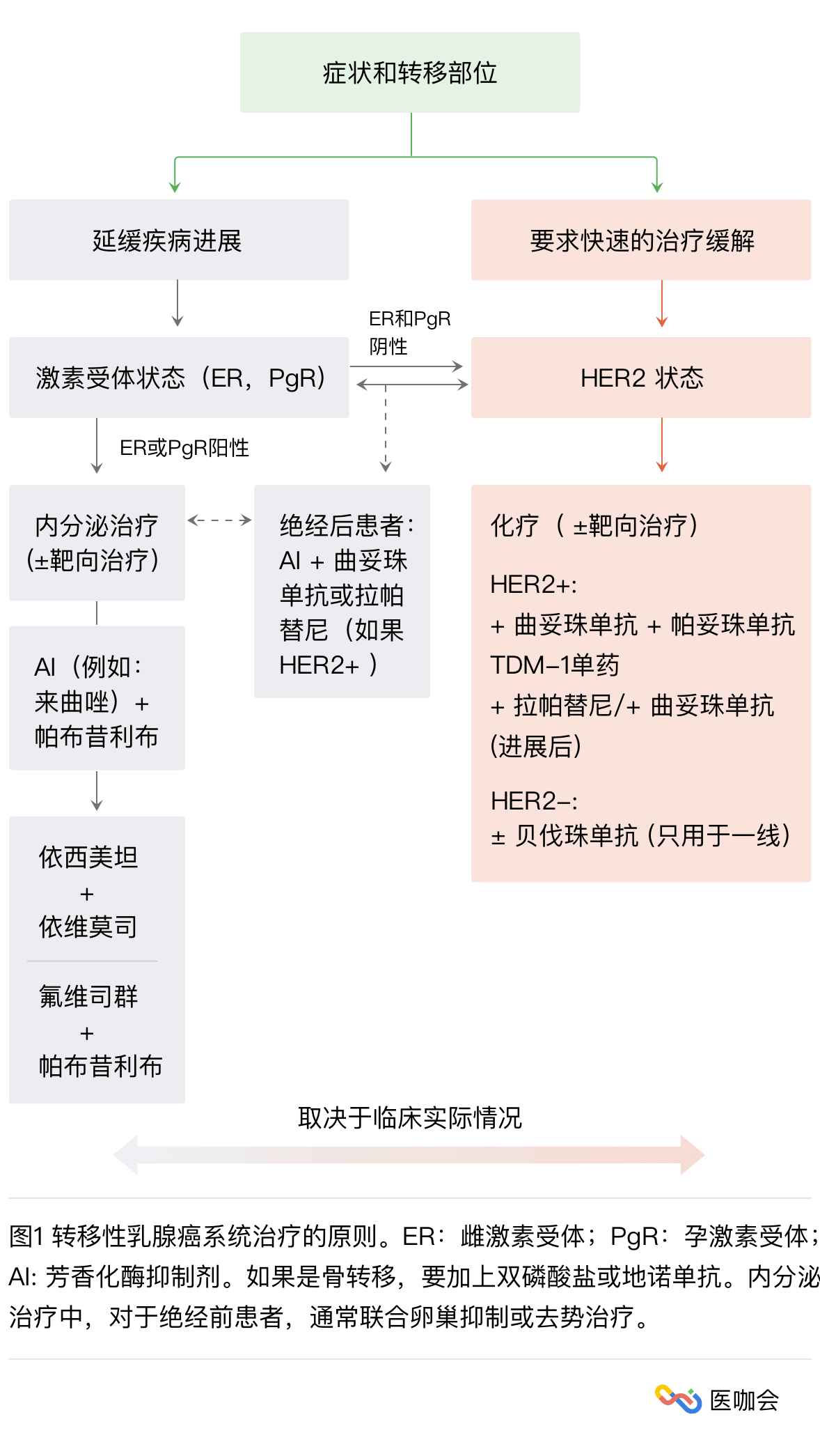 转移性乳腺癌的治疗目标是延长生存期,维持生活质量,以及缓解症状。肿瘤生物学特征以及患者既往接受的治疗方案都会影响后续的治疗选择。