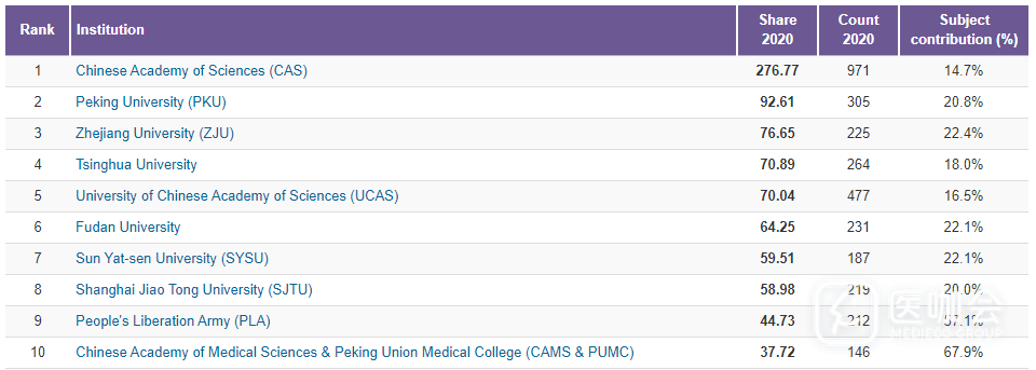 2015年到2020年,中国的TOP5学术机构的Share值占到中国整体的25%。
