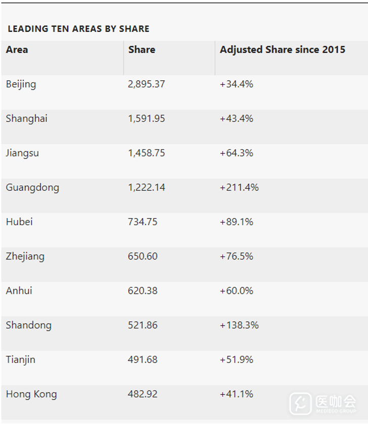 下图显示了2020年中国Nature Index排名(基于share数值)的前10大地区,可以看到,表现良好的研究机构集中在东部地区。
