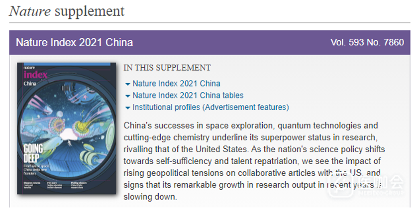 2021年5月27日,《自然》杂志增刊发布了《Nature Index 2021 China》专题,聚焦中国的科研进展,公布了TOP100机构排名,细分领域包括生命科学、化学、物理、地球与环境科学等领域。