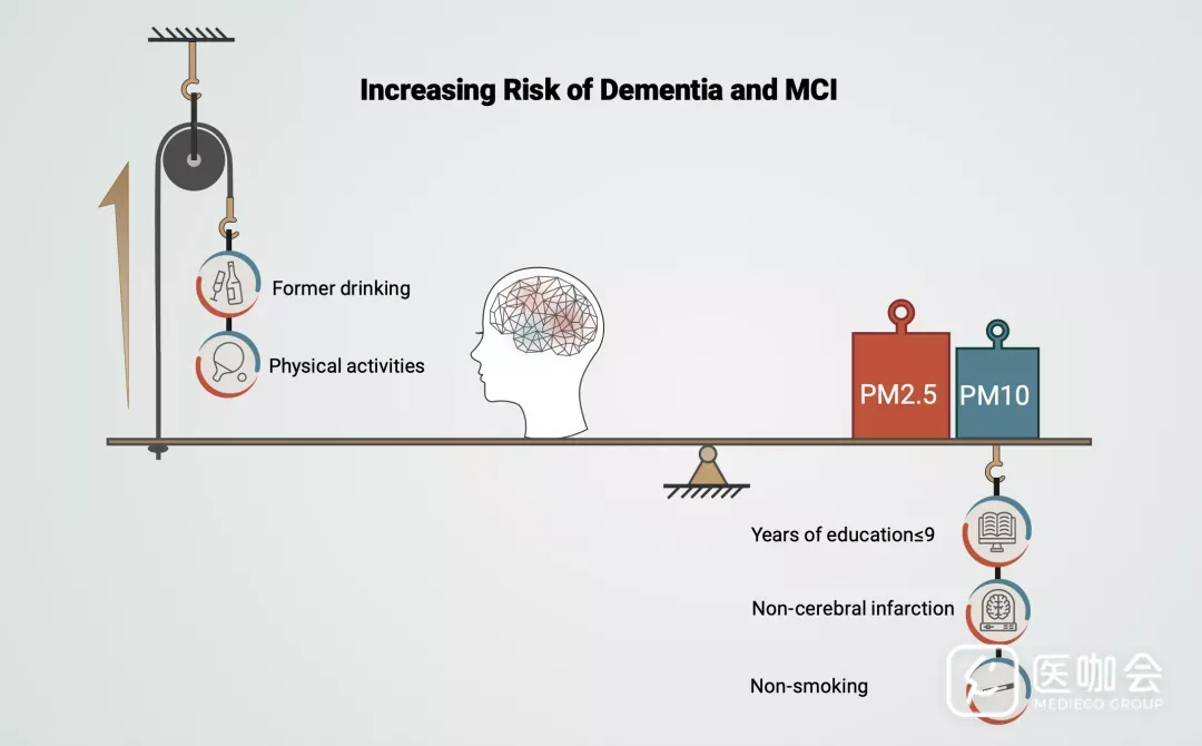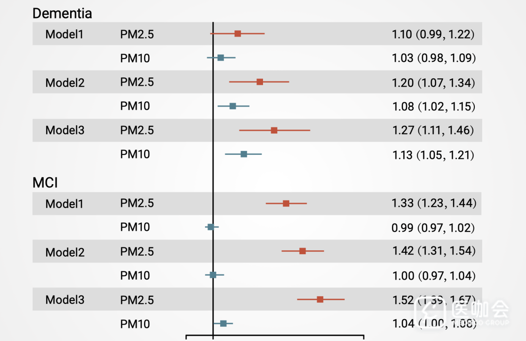 PM2.5浓度每升高10 μg/m3(相当于一年中有73天从“良”变为‘轻度污染’)痴呆和MCI的风险分别增加27%和52%;PM10浓度每升高10 μg/m3,痴呆和MCI的风险分别增加13%和4%。