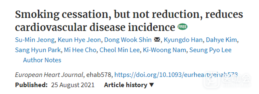 2021年8月25日,《欧洲心脏杂志》(影响因子:29.983)发表了来自韩国的一项研究,评估戒烟和减少吸烟与心血管疾病风险降低的相关性。结果显示,戒烟可以降低心血管疾病的发病率,但减少吸烟不能降低发病率。