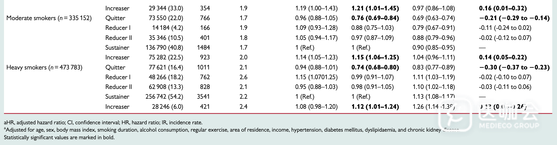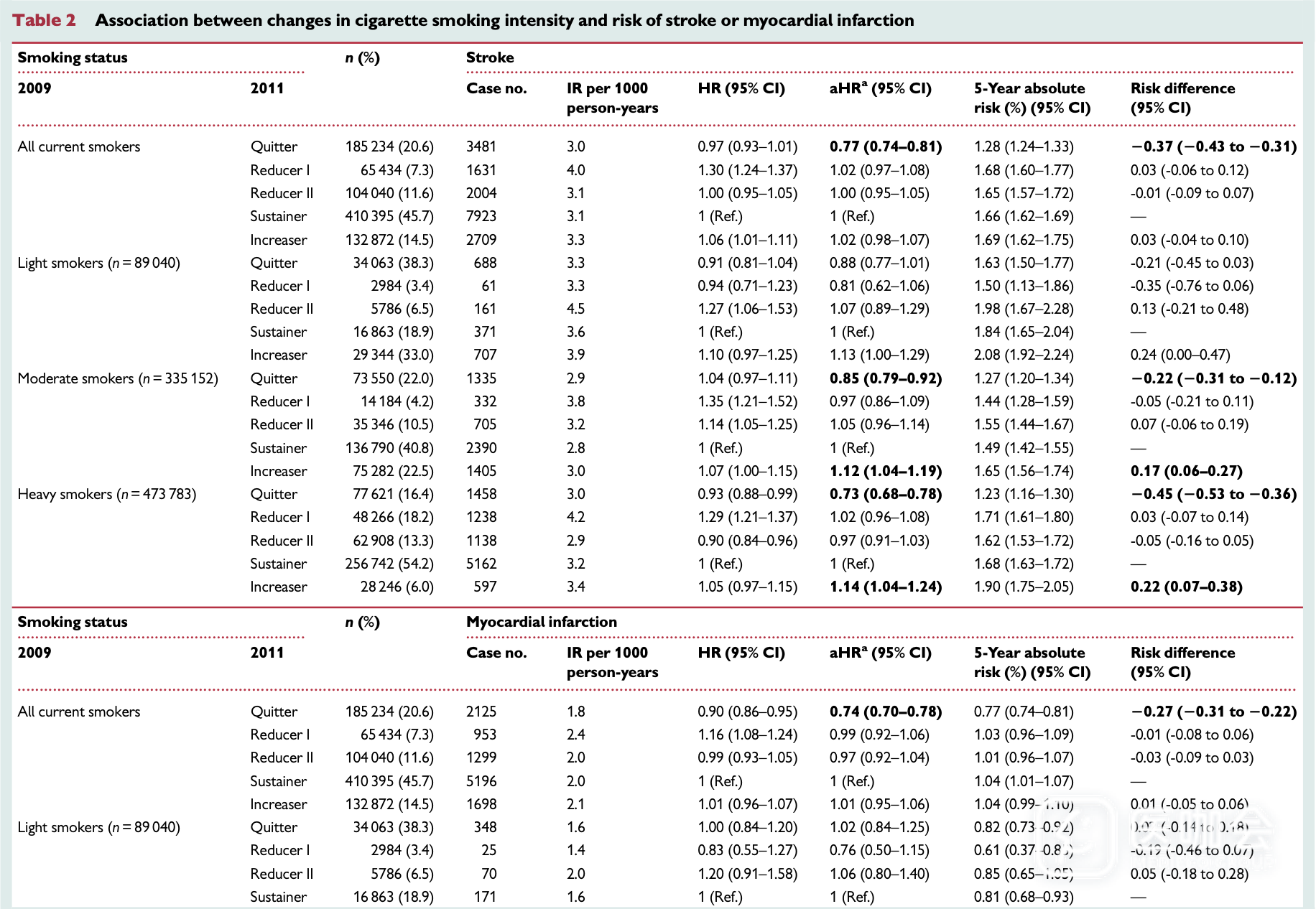 在随访期间,共有17748名参与者发生了卒中,11271名参与者发生了心肌梗死。调整了人口因素、合并症等混杂因素后,与吸烟量保持不变者相比,戒烟者的卒中(aHR 0.77, 95%CI 0.74–0.81)和心肌梗死(aHR 0.74, 95%CI 0.70–0.78)风险明显降低。