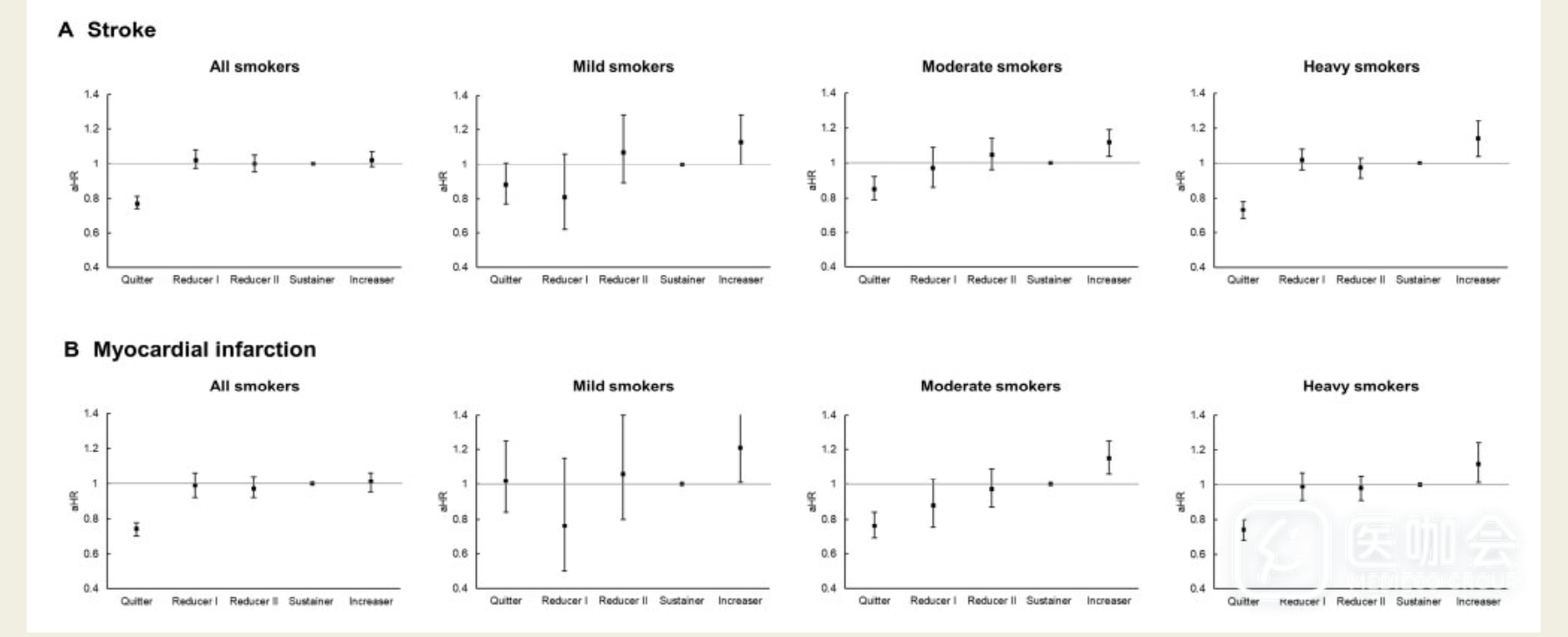吸烟量I类减少者和II类减少者的卒中和心肌梗死发生风险,与吸烟量保持不变者没有显著差异。