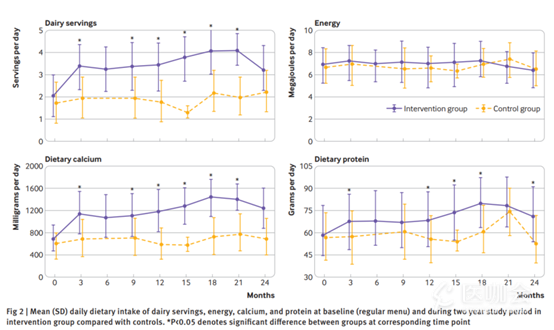 研究开始后,干预组每天会额外多摄入250mL牛奶+20g奶酪(或100g酸奶),这些可以提供562mg钙和12g蛋白质。因此,干预组每天的总钙和蛋白质摄入量分别为1142mg和69g,而对照组为700mg和58g。