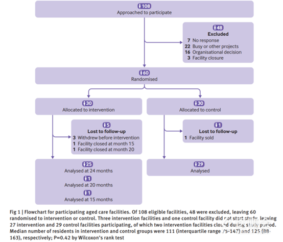最终,54家机构完成了为期24个月的干预;随机分组后,对照组1家机构和干预组3家机构退出研究;15个月和20个月时,干预组2家机构关闭,研究纳入了截止关闭日期的数据。研究的主要终点为骨折发生率、跌倒发生率和全因死亡率。