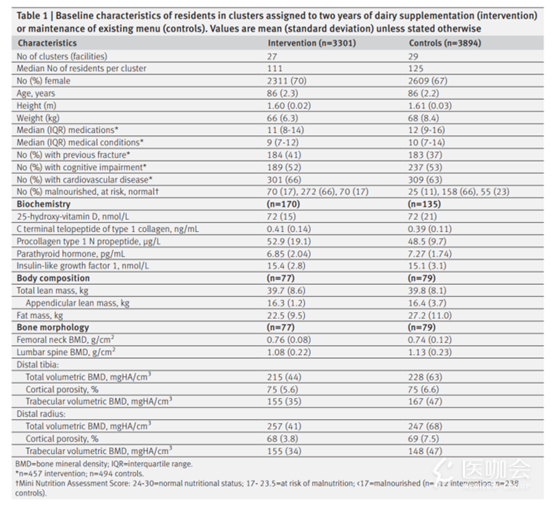 研究随机抽取30家机构作为干预组(n=3301),为老年人提供额外的牛奶、酸奶和奶酪,总钙摄入量为1142mg/天,蛋白质摄入量为69g/天(1.1g/公斤体重/天)。另外30家机构作为对照组(n=3894),维持常规食物供应,钙摄入为700mg/天,蛋白质为58g/天(0.9g/公斤体重/天)。