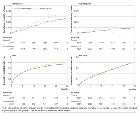 随访期间,共观察到324例骨折,包括干预组121例(3.7%)和对照组203例(5.2%),干预组的骨折风险降低了33%(HR 0.67, 95% CI 0.48-0.93; P=0.02)。事后分析表明,干预组髋部骨折的发生率为1.3%(n=42),对照组为2.4%(n=93),干预组的风险降低了46%(HR 0.54, 95% CI 0.35-0.83; P=0.005)。