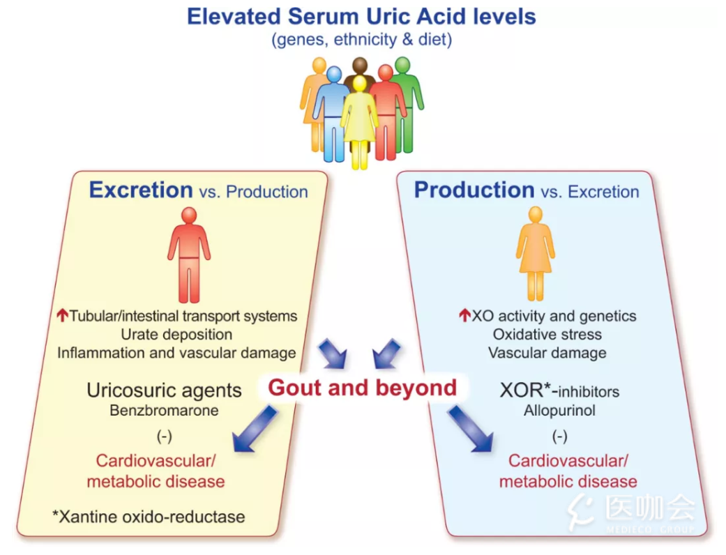 总而言之,痛风的有效治疗应该包括正确识别患者以及预防关节疾病和心血管疾病。黄嘌呤氧化还原酶抑制剂和促尿酸排泄药物是治疗的基石,在全球范围内的使用情况存在差异。这些药物涉及高尿酸血症有关的两种最重要机制,即尿酸生成过多和/或排泄不足。确定两类药物在心血管预防方面的潜在差异是一个核心问题,但应该在多民族人群以及使用预先定义的患者人群中进行。