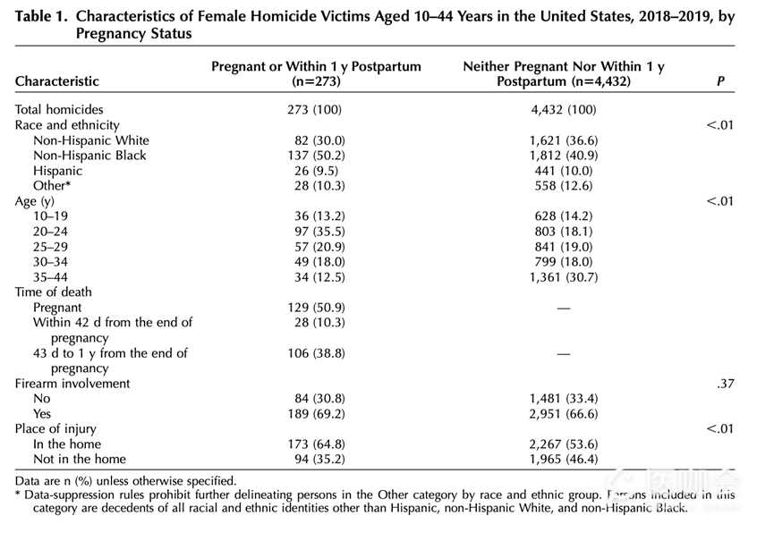 2003年,美国开始要求在死亡证书上注明死者是否为孕期死亡,或妊娠结束后42天内或1年内死亡。今年,Wallace等分析了这些数据,根据统计,在2018年和2019年,共有273名美国孕产期女性死于凶杀。