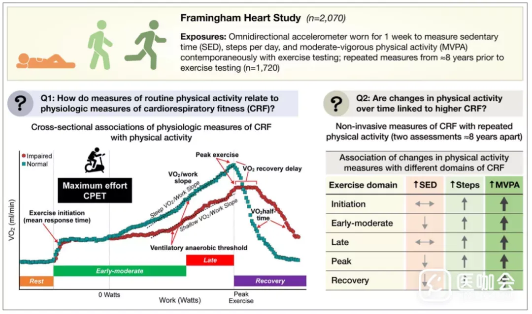 该研究纳入的2070名参与者,进行心肺运动试验(CPET)并佩戴加速度传感器1周,获取客观的体育锻炼数据,包括久坐时间(SED)、每天的步数、中等或高强度体育锻炼(MVPA)。