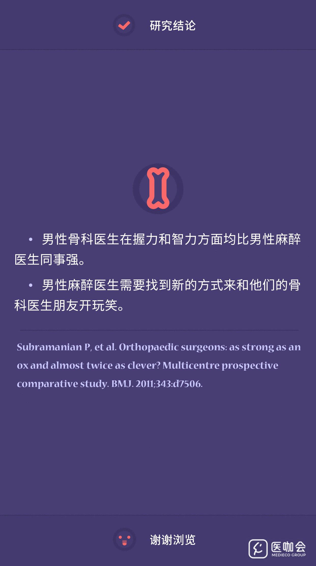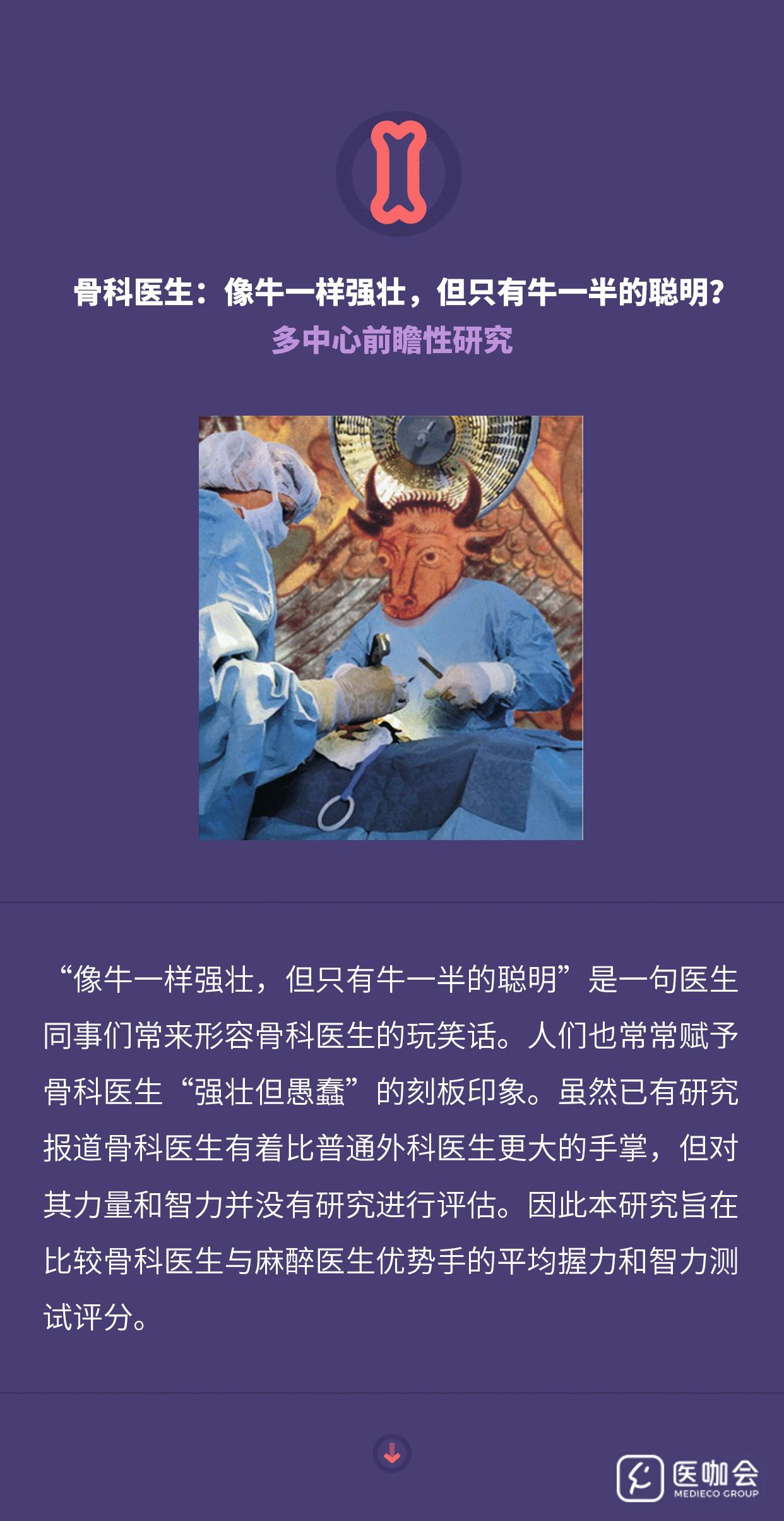 BMJ曾发表了一项很有意思的研究,对骨科医生和麻醉医生的握力和智力进行了比较。为什么会有这样一个研究呢?源自于人们对骨科医生的一句玩笑话:“像牛一样强壮,但只有牛一半的聪明”。事实真的如此吗?我们得看证据呀,所以一起来瞅瞅这项多中心前瞻性研究吧。