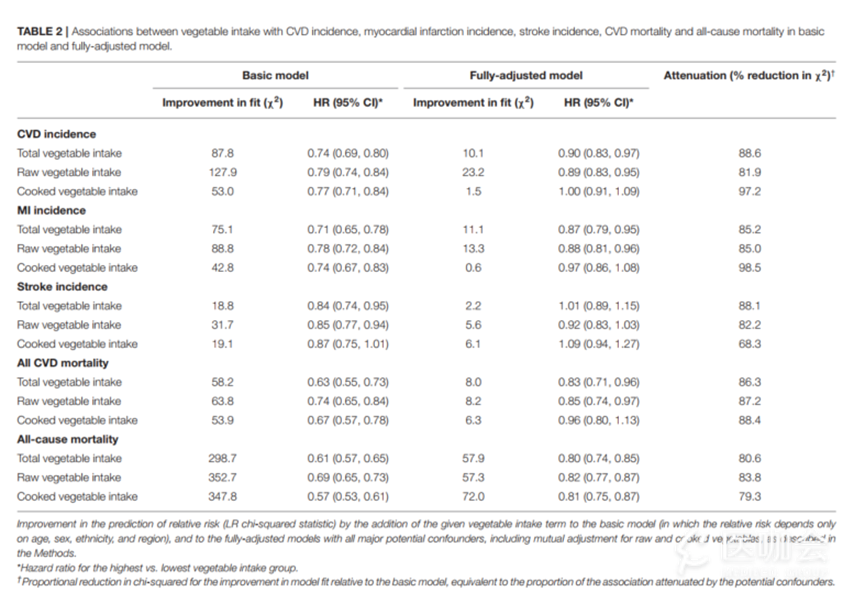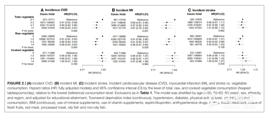 中位随访12.1年期间,共发生了18,052例心血管疾病,包括11,317例心肌梗死和6,969例卒中。心血管疾病发生风险与总蔬菜摄入量以及生蔬菜摄入量存在负相关关系,但与煮熟蔬菜摄入量之间不存在相关性。