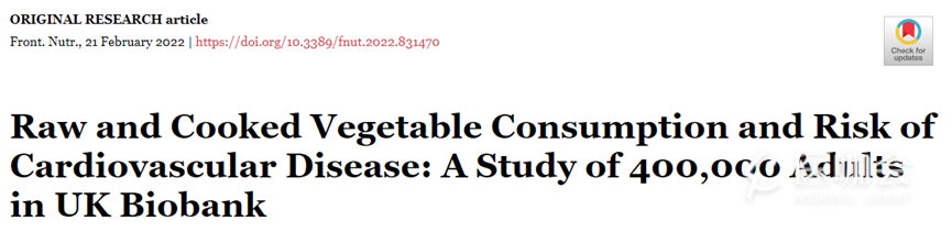 2022年2月21日,《Frontiers in Nutrition》(影响因子:6.576)期刊发表了一项包含40万人的大型研究的结果,评估了煮熟的蔬菜或生蔬菜摄入量对心血管疾病的影响,结果显示,多吃生蔬菜与心血管疾病风险降低存在相关性,但煮熟的蔬菜却无此相关性。
