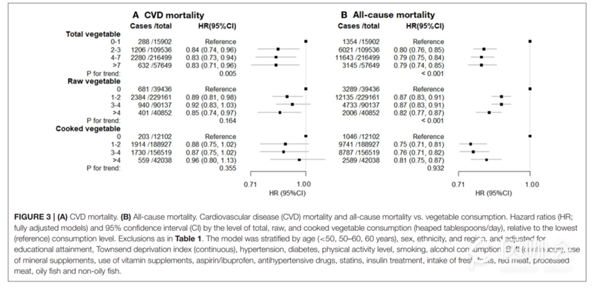 中位随访12.1年期间,共发生了13,398例死亡,其中4406名因心血管疾病死亡。每天食用≥2勺蔬菜与心血管疾病死亡风险降低存在相关性(HR=0.83, 95% CI 0.71–0.96)。结果表明,心血管疾病死亡率与生蔬菜摄入量呈负相关(HR=0.85, 95% CI 0.74–0.97),心血管疾病死亡率与煮熟蔬菜摄入量无相关性。