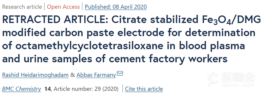 这篇文章标题为“Citrate stabilized Fe3O4/DMG modified carbon paste electrode for determination of octamethylcyclotetrasiloxane in blood plasma and urine samples of cement factory workers”,2020年8月8日发表于《BMC Chemistry》,作者是伊朗哈马丹医科大学Rashid Heidarimoghadam和Abbas Farmany。Farmany恰好是期刊编辑委员会的成员,但是在文章发表后才加入的。