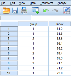 有研究者认为,学历越高生活幸福指数越高。为了验证这一假设,研究人员招募了31名研究对象,分别调查他们的学历水平,并测量生活幸福指数。根据学历的高低,研究对象被分为4组:高中及以下、本科、硕士研究生、博士研究生,变量名为group。利用专业的量表得分来评估研究对象的幸福指数,变量名为Index,满分为100分,得分越高代表幸福感越强。研究者想知道,幸福指数的高低是否与学历水平有关,即幸福指数Index的平均得分是否随着学历group变量的不同而不同。部分数据如图1。