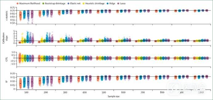 图2. 箱线图通过短水平线(中位数)及散点分布,展示不同建模方法与训练样本量下,所开发模型在大型验证数据集中的预测性能波动情况