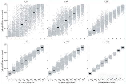 同一人群进行1000次等量样本抽样训练(每次样本量相同),基于这1000个模型对9个个体分别生成1000次预测,结果发现预测值存在显著波动(图1)。当样本量较小时(如本例中n=50或100),个体预测风险值可能在0到1之间任意波动,与其真实风险(基于大样本测算)无关;而当样本量足够大时(如n=5000),预测值的波动范围大幅收窄,结果可靠性显著提升。