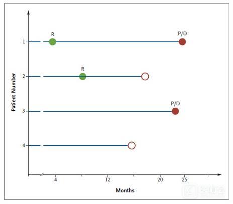 - 第四位患者始终未出现缓解,并在第15个月非信息性删失。