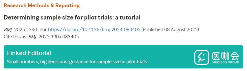 2025年8月,BMJ发表了一篇方法学文章,为预试验样本量计算提供了实用的指导建议和工具,包括分步示例、样本量表格以及统计代码。R Shiny应用程序以及常用软件(如R、Stata、SAS)的统计代码可在线获取:https://github.com/xiying5/PilotSize