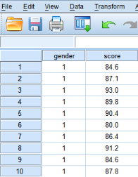 某班级老师拟比较该班级本次考试中,男生和女生的考试成绩是否有差异,该班级男生和女生各有20名同学,变量名记录为gender,分别赋值为1和2,考试成绩变量名记录为score,部分数据如图1。