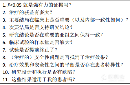 新英格兰医学杂志刊出的一篇综述《The Primary Outcome Is Positive — Is That Good Enough?》中[1],作者认为当临床试验的主要结局阳性时,还应当考虑11个问题。(表1)