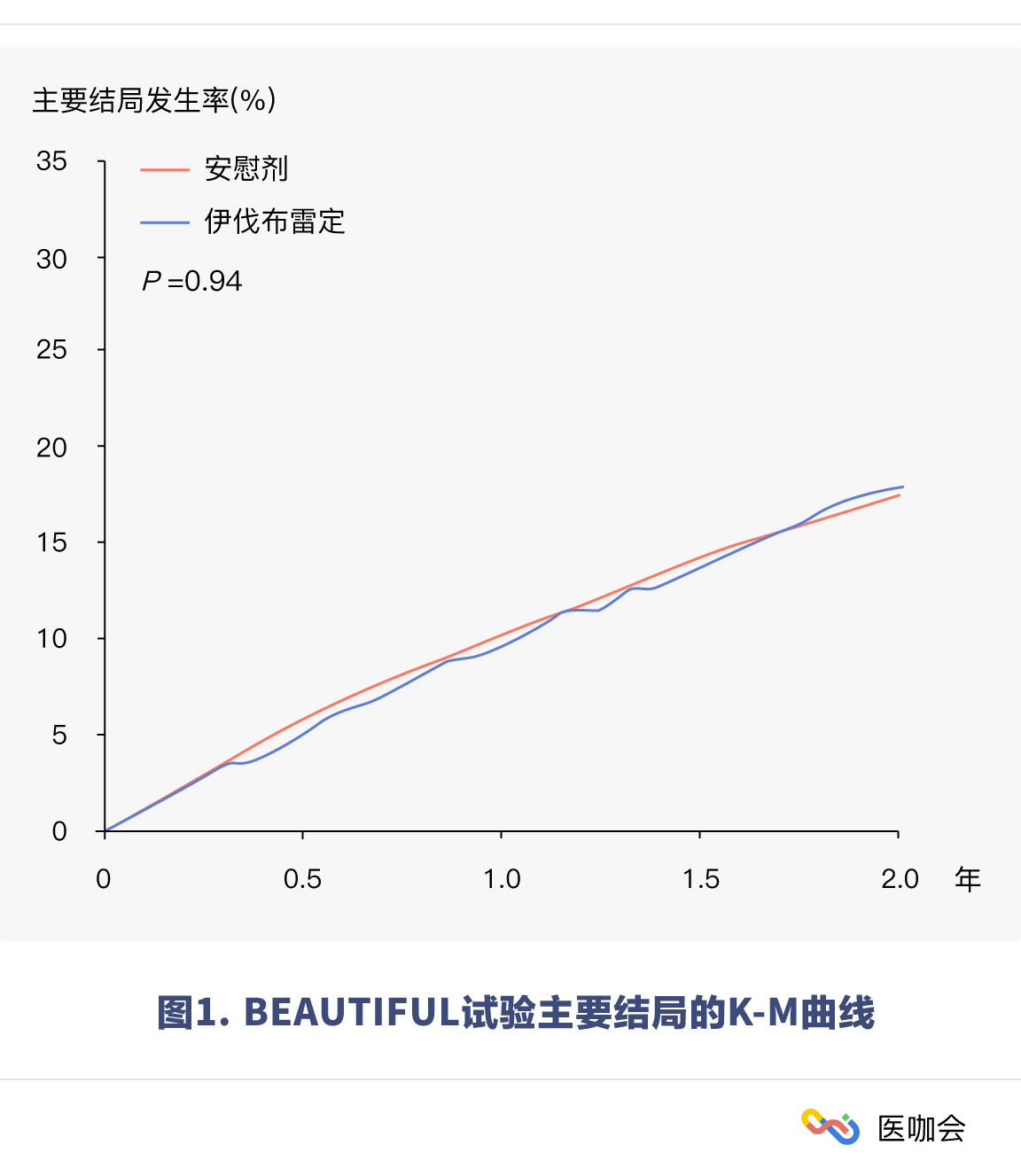 主要结局为复合结局,包括心血管死亡、急性心梗住院、新发心衰或因心衰恶化住院。伊伐布雷定治疗6、12、24个月后能使患者心率分别减慢7.2、6.4、5.6次/分。但伊伐布雷定组与安慰剂组相比,主要终点发生率无显著差异。(HR:1.00;95%CI:0.91–1.10;P=0.94;图1);不良发应事件的发生率也没有显著变化(22.5% vs 22.8%;P=0.70)。