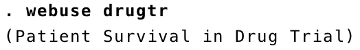 我们将使用Stata自带的一个模拟的药物临床试验的数据集进行所有的演示,请大家在Command对话框中输入webuse drugtr以调入这个数据集。