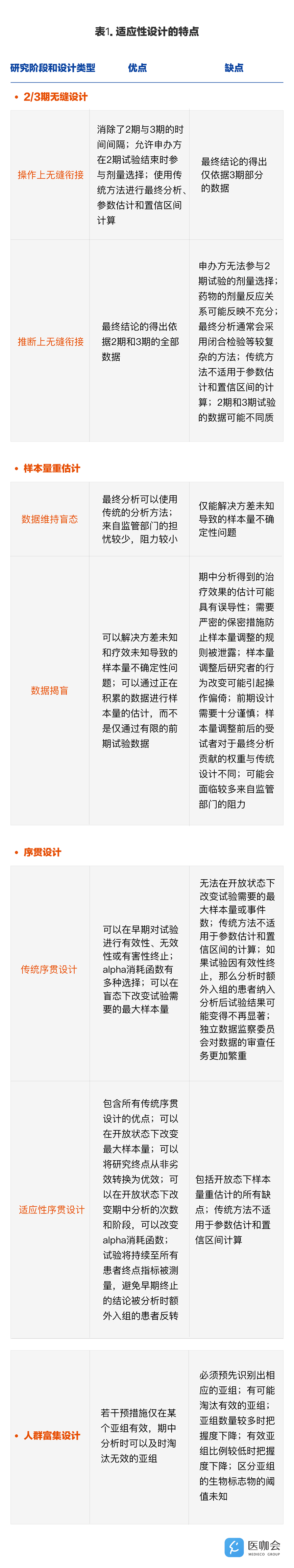 表1中,验证性临床试验的适应性设计类型被分为4类——2/3期无缝设计、样本量重估计、序贯设计以及人群富集设计。另外表1中还列出了每种设计相对于传统设计的优缺点。表中不同种类的设计可以交叉,比如,样本量重估计可以和序贯、剂量选择或富集设计联合使用。