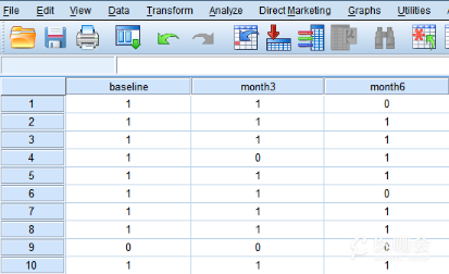某康复科医生拟评价行为干预对卒中患者戒烟行为的效果。患者分别在基线、干预3个月和干预6个月时进行调查。该医生想知道干预后研究对象戒烟的比例是否一直上升。因此,随机选取了63例进行行为干预的研究对象,并收集了所有研究对象基线(baseline),干预3个月(month3)和干预6个月(month6)的吸烟状态。吸烟赋值为1,不吸烟赋值为0。部分数据如图1。