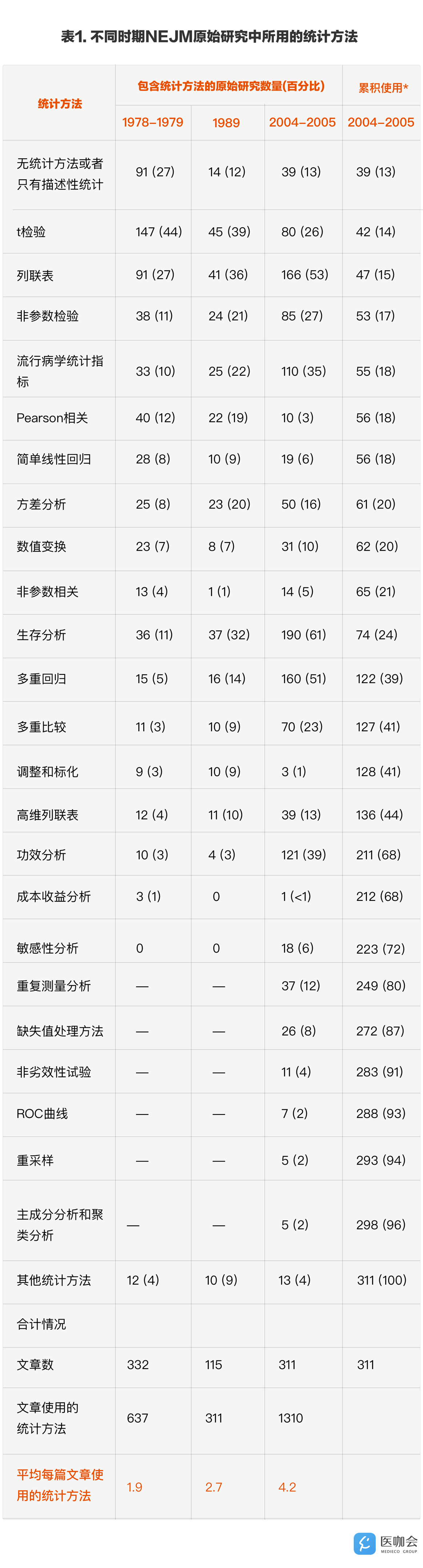 相比1978-1979以及1989年,2005年的文章增加了新的统计学方法。表1显示了不同时期,NEJM原始研究中所用的统计方法。(每种统计方法的中英文对照和举例详见文章最后的附录)
