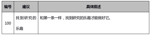 Brennan教授将这100条建议分成6部分,第一部分是进行研究的一般性建议(11);第二部分是研究设计的原则(20);仅把研究做好还不够,写作的质量好坏是成功发表的重要因素,所以第三部分内容最多(39);第四部分为会议投稿(6);第五部分为研究发表前需注意的问题(17);第六部分讲了合著者的问题(6);还有一条关于做研究最重要的建议(1)。