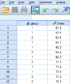研究者想研究学历与生活幸福指数间的关系,招募31名研究对象询问其学历水平(group)并测量生活幸福指数(Index)。学历水平分为4组,包括高中及以下、本科、硕士和博士。生活幸福指数满分为100分,得分越高代表生活越幸福。部分数据如图1。研究者应该如何展示比较结果呢?