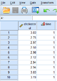 研究者想研究不同静坐时长的健康男性中血胆固醇水平差异,故招募100名研究对象询问其每天静坐时长(time),并检测其血液中胆固醇水平(cholesterol),部分数据如图1。研究者该如何绘图展示这两者间的关系呢?