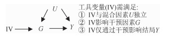 (1)工具变量法:是由PG. Wright于1928年首次提出,最早应用于经济和社会学,最近开始用于流行病学领域对未测量混杂因素的控制。工具变量需满足:与所研究的干预相关;与结局无关,仅通过干预因素影响结局;独立于混杂因素。见图 1。