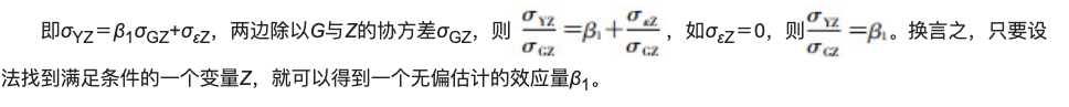 工具变量法的统计原理:假设Y为结局,G为协变量,在传统最小二乘法统计模型的左右两边增加工具变量Z,同时取协方差,可得: