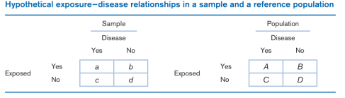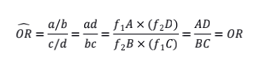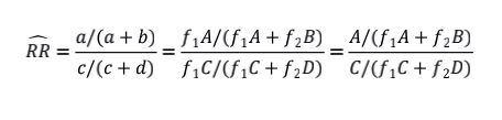 如图所示,一个假想的病例对照研究,其中假设我们对总体的发病情况已知:即图右侧的2×2表格,其中A、B、C、D分别代表相对应的个体数量。在病例对照的样本中(图左侧表格),我们假设从总体患病个体中随机抽取f1比例的样本,从总体非患病个体中随机抽取f2比例的样本,为了方便,我们同时假设不存在抽样误差。因此,样本中的个体可以表示为a=f1A,c=f1C,b=f2B,d=f2D。则我们可以计算RR的估计值为: