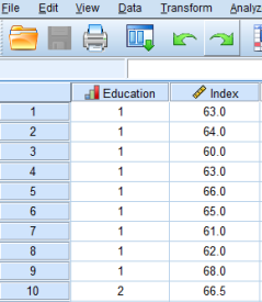 幸福指数采用问卷测量,得分在0-100之间分布,分数越高,幸福指数越强。最终收集了研究对象的幸福指数(Index)和受教育程度(Education),部分数据如图1。对于该数据,如何绘图展示查看不同受教育程度类别中幸福指数的分布呢?