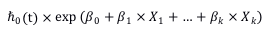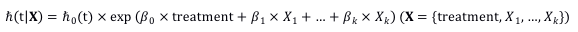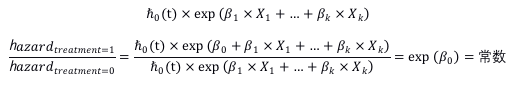 从上面的式子可以看出,当X1,...,Xk一定时,treatment等于1时的hazard为